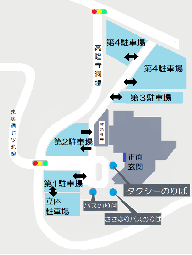 それ以外の時間帯は、その場所に外来患者さん等は駐車をすることができます。 - 立体駐車場へは第1駐車場内から出入りができます。ご利用できるのは屋上階と2階ですが、正面玄関へは屋上階から第1駐車場を経由します。