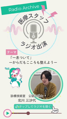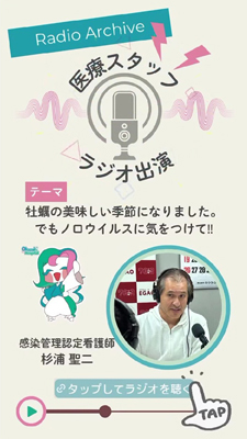 エフエムEGAOにて放送中の「イブニングチャージ」(毎週月から金曜日 17:00から18:45)内の「いまどき旬」コーナー (18:00から20分)に月に1回当院の医療スタッフが出演し、リスナーの皆様の健康づくりを応援します。ぜひお役立てください。