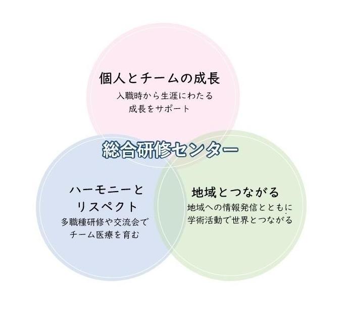 総合研修センターは、当院の行動規範のValuesの1つ「個人とチームの成長」を担っています。職員全体の教育・研修活動とともに、専門資格の管理、学術活動の支援などを通じて、職員が意欲をもって働き、スキルアップができるよう支援しています。また、個人だけでなく、チームの成長が病院の医療の質を高める上で欠かせません。同じ病院で働く仲間として、多職種研修や学術交流会を開催し、当院のもう一つのValue「ハーモニーとリスペクト」を大切にしています。そして、3つ目のValue「地域とつながる」のために、当院の活動について情報発信し、地域の多職種の方々も参加できる講演会、研修会なども開催しています。上記を通じて、病院のVisionである「地域から信頼され選ばれるエクセレント・ホスピタル(最高の病院)」を目指し、「地域とともに“ウェルビーイング(持続的な幸せ)”を創造する」Purposeに貢献したいと考えています。