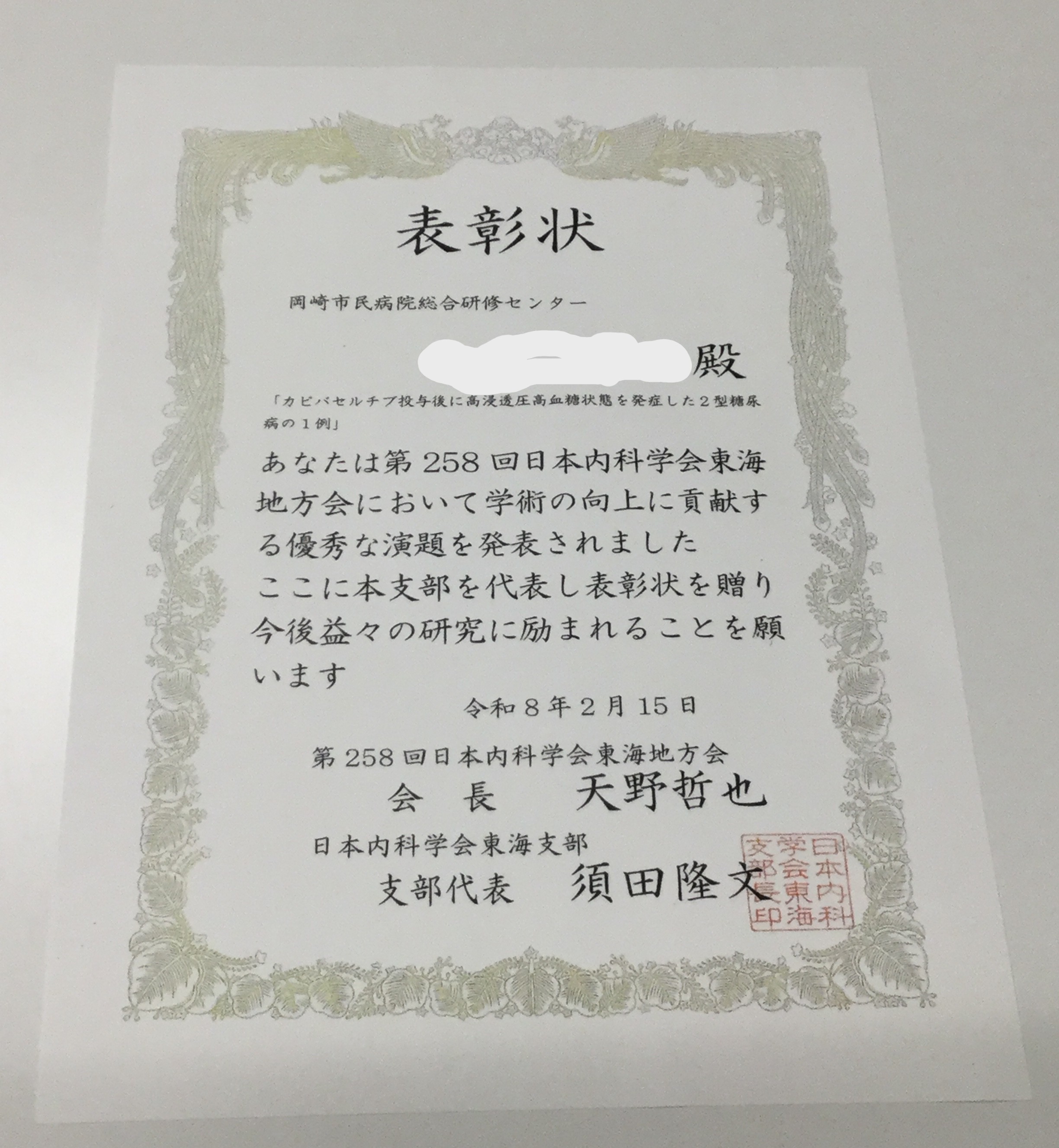 当院では「岡崎市民病院 初期研修医 学術集会・発表会」での院内発表が義務付けられており、1年次の院内発表で、皆さんからの質疑応答で鍛えられたcase reportです。